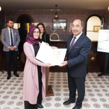 ASBÜ Hazine Müzesi Müdürü Mehtap Tursun’un müzeyi tanıtan açılış konuşması ardından program, Hat Sanatçısı Meral Ünver ve Üniversitemiz Sanat ve Tasarım Fakültesi Dekanı Prof. Dr. Abdullah Şevki Duymaz’ın konuşmalarıyla devam etti. Ardından Hat ve Tezhip Sanatçıları Meral Ünver ve Büşra Tuzci’ye ASBÜ Sanat ve Tasarım Fakültesi Dekanı Prof. Dr. Abdullah Şevki Duymaz tarafından teşekkür belgeleri takdim edildi.